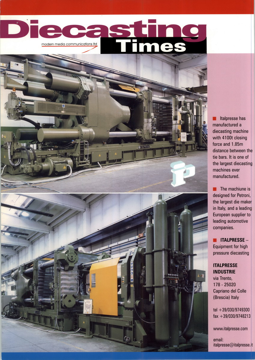 意大利ITALPRESSE壓鑄機公司致力于壓鑄事業(yè),與意大利國家工業(yè)一同發(fā)展。將近33年,從地方性的一手工業(yè)為主的國家發(fā)展成為注重技術(shù)革新,出口東方的強大經(jīng)濟實體。從開始一直今天意特壓鑄機公司跟擁護保持密切的關(guān)系,把自己工業(yè)計劃建立在適合人的范圍。ITALPRESSE 壓鑄機公司從八十年代打開亞洲市場,并建立了它的商業(yè)網(wǎng)絡(luò),加強提高了售后服務質(zhì)量。意特壓鑄機公司特別注重培養(yǎng)技術(shù)人員,特別是客戶派出的技術(shù)人員。