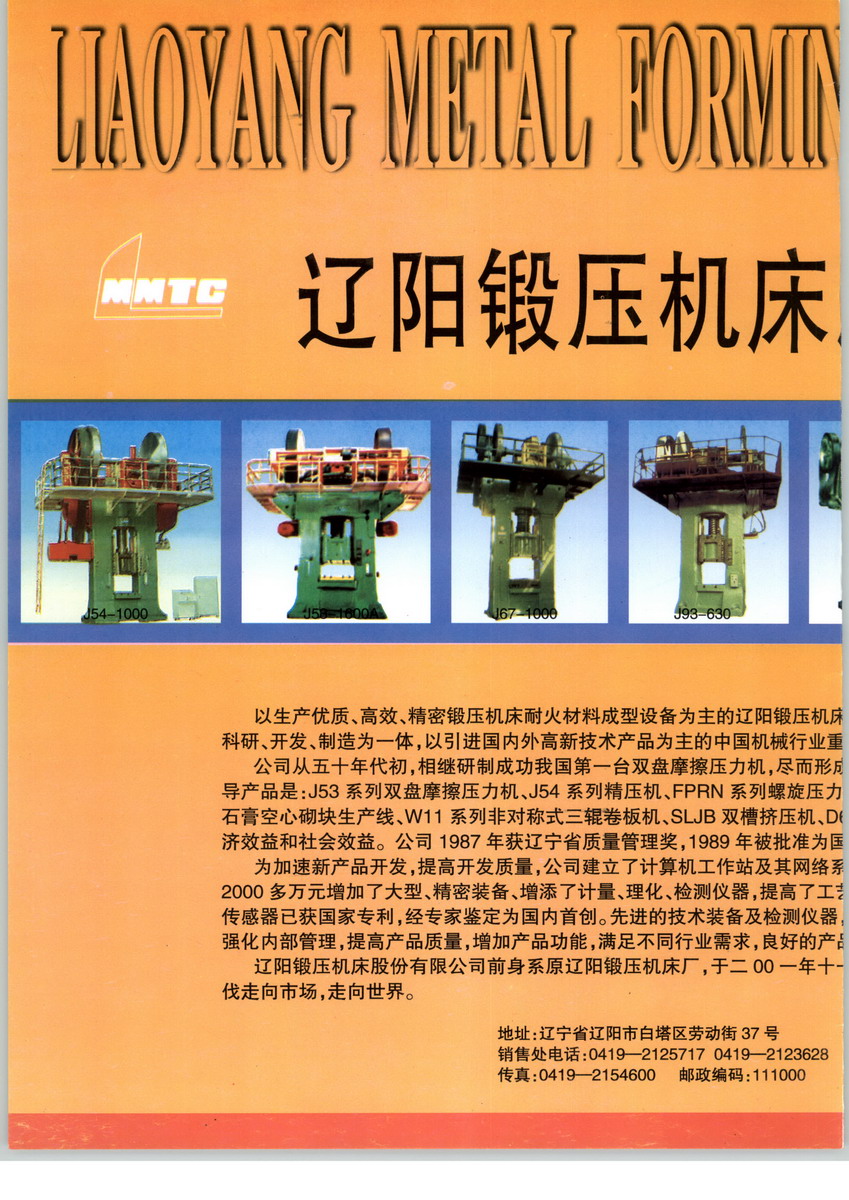 遼陽鍛壓機床股份有限公司始建于一九三六年,前身為遼陽鍛壓機床廠,在轉(zhuǎn)換企業(yè)經(jīng)營機制過程中,于二00一年整體改組為由自然人控股的股份制企業(yè)。公司經(jīng)過七十年的發(fā)展壯大,已成為一個集科研、開發(fā)、制造為一體,以引進國內(nèi)外高新技術(shù)產(chǎn)品為主的中國機械鍛壓行業(yè)重點企業(yè)之一連續(xù)二十多年被評為省、市重合同、守信用單位是同行業(yè)最早通過中國質(zhì)量認證中心ISO9001:2000質(zhì)量管理體系認證的單位同時也是國內(nèi)最早、最大的雙盤摩擦壓力機生產(chǎn)廠家,所生產(chǎn)的壓力機多次被省市評為優(yōu)質(zhì)產(chǎn)品是機械部首批24個質(zhì)量承諾單位之一,公司具有進出口自營權(quán)。產(chǎn)品質(zhì)量一年內(nèi)實行三包。