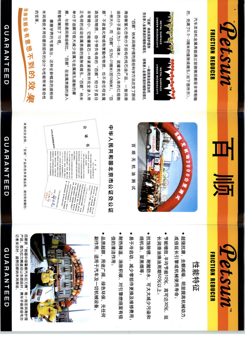 我北京百順華美科技有限公司代理美國百順(Petsun)液相納米潤滑護理劑,同時公司為專業(yè)潤滑油生產(chǎn)企業(yè),所生產(chǎn)的百順納米潤滑油(車用及工業(yè)用油)是選用優(yōu)質(zhì)基礎(chǔ)油和國外復合添加劑及純烴納米單分子護理劑科學調(diào)制而成,與當今世界領(lǐng)先地位的高效節(jié)能、低磨損、低污染、快啟動、長久耐用的潤滑油品總趨勢同步!百順納米潤滑油北京生產(chǎn)基地作為美國PETSUN國際公司授權(quán)加工調(diào)配基地,已融入當代高新科技和21世紀企業(yè)經(jīng)營理念,產(chǎn)品通過ISO9001質(zhì)量和ISO14001環(huán)境國際體系認證。符合美國石油學會API標準,美國汽車工程師協(xié)會SAE標準,歐洲汽車制造商協(xié)會ACEA標準及中國國際標準ISC產(chǎn)品認證,產(chǎn)品品質(zhì)達到國際領(lǐng)先水平。